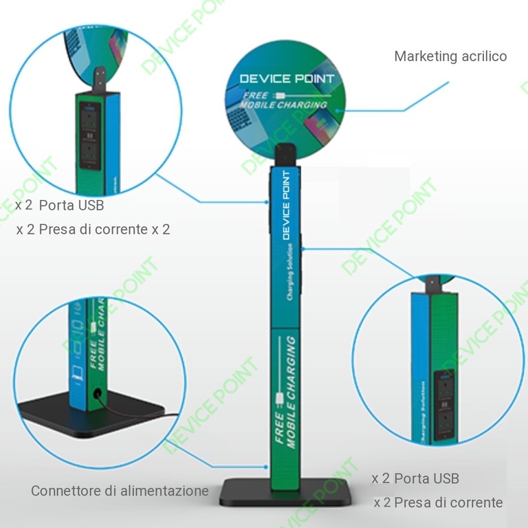 Con questa colonnine di ricarica cellulari ogni vostro ospite/cliente potrà caricare liberamente la batteria dei suoi device. La D.P. PILLAR è una colonnina ricarica cellulare che consente di ricaricare qualsiasi dispositivo presente nel mercato attuale.