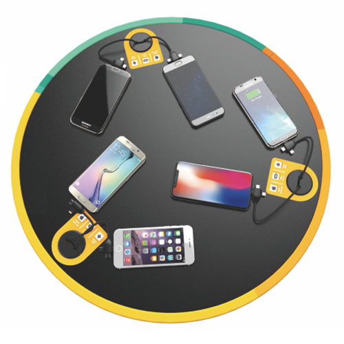 La sua base dispone di 6 cavi (in nylon) di ricarica, ogni uno dei quali ha 3 prese di ricarica (Micro USB, Apple MFI Lightning e Type C), potendo così ricaricare tutti gli smartphone/dispositivi presenti nel mercato attuale.