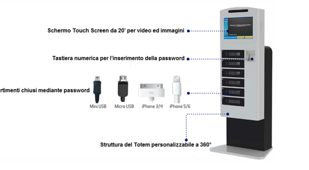 Totem che permette la ricarica degli smartphone depositandoli in cassetti di sicurezza . Il monitor touchscreen rende questo strumento ideale per aumentare l’engagement (permettendo agli ospiti di esprimere i propri suggerimenti attraverso survey, o intrattenerli sfruttando le nostre proposte di gamification) ed incrementare le revenue grazie alla vendita di spazi pubblicitari presenti su tutti i nostri strumenti.